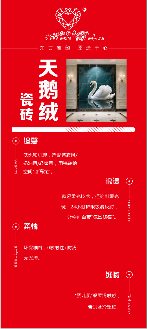 三、百搭風格,演繹家居時尚美學。 在設計風格上,它堪稱 “百搭能手”。紅鉑來瓷磚簡潔高雅的外觀,適配各類空間:客廳鋪設,盡顯大氣;臥室裝點,滿溢溫馨;廚衛應用,增添精致。不管是簡約現代風,還是北歐清新、工業復古風,它都能無縫融入,提升家居格調。 選天鵝絨(肌膚釉)瓷磚,就是選擇高品質生活。新品現已上市,誠邀您前往專賣店體驗選購。