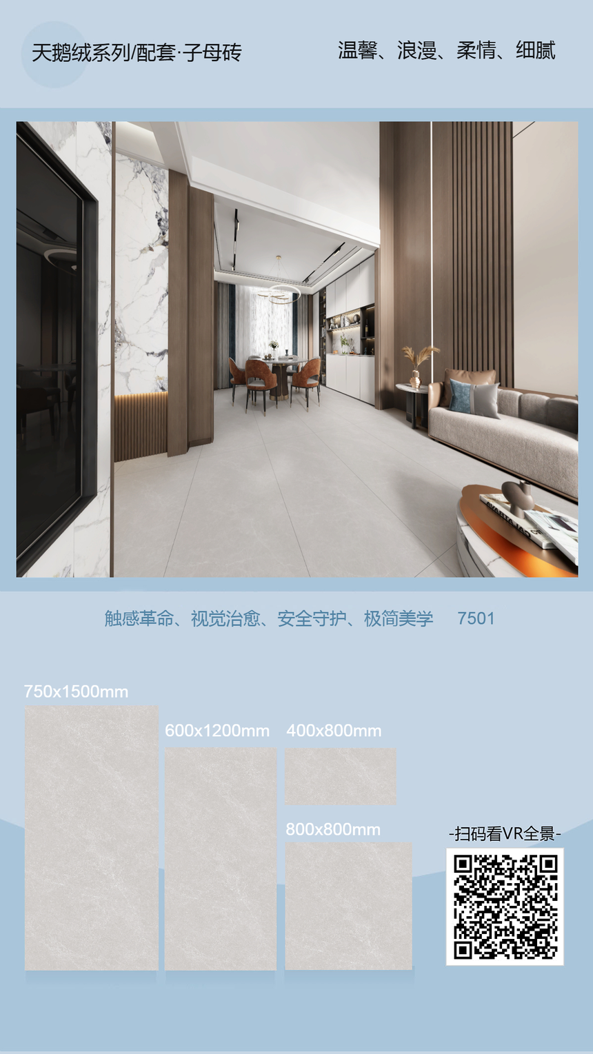新品登場!天鵝絨(肌膚釉)系列瓷磚家,承載著我們對舒適與美的向往。天鵝絨(肌膚釉)系列瓷磚璀璨上市,為打造理想家園帶來全新可能。 一、觸摸云朵般的細膩,享受柔和視覺盛宴 輕觸天鵝絨(肌膚釉)系列瓷磚的表面,宛如將手探入蓬松云朵,又似輕撫嬰兒肌膚,輕柔細膩之感令人沉醉。這得益于特殊的肌膚釉工藝,經多道精細打磨,賦予瓷磚無可比擬的柔滑質感。其視覺效果同樣出眾,摒棄傳統瓷磚的刺眼反光,呈現柔和溫潤光澤,有效緩解視覺疲勞,無論晝夜,都能營造溫馨放松的氛圍。 二、安全健康,為家人的生活保駕護航。 安全健康是家庭裝修的關鍵,天鵝絨瓷磚嚴選環保原料,從源頭杜絕放射性物質,生產全程遵循國家標準,且避免光污染,為家人健康保駕護航。
